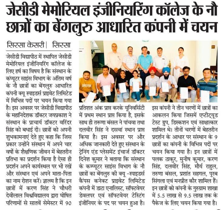 Nine final-year students from the Computer Science Department of JCD Memorial Engineering College have been selected for various roles at QSpiders Campus Connect Pvt. Ltd., Bengaluru. The selection was made after a three-stage process consisting of an aptitude test, group discussion, and interview.