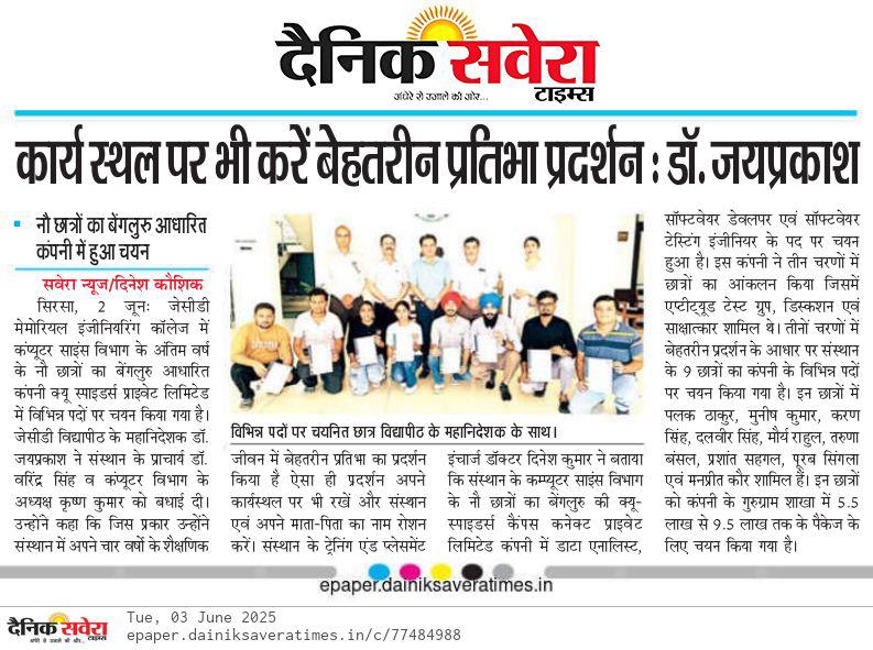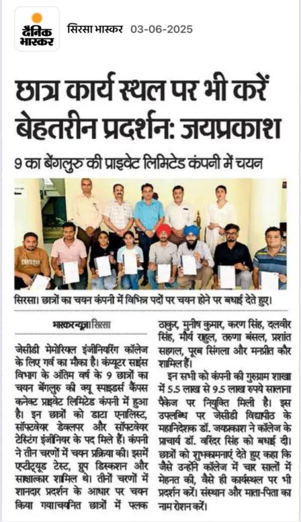 On this occasion, the Director General of JCD Vidyapeeth, Dr. Jai Parkash, congratulated the Principal of the institution, Dr. Varinder Singh. Extending his best wishes to the students, he said that just as they have demonstrated excellent talent during their four-year academic journey at the institution, they should maintain the same level of excellence at their workplace as well, thereby bringing pride to both the institution and their parents. He appreciated the efforts of Dr. Dinesh Kumar, the Training and Placement In-charge of the institution, for this success and also congratulated Er. Krishan Kumar, Head of the Computer Science Department.